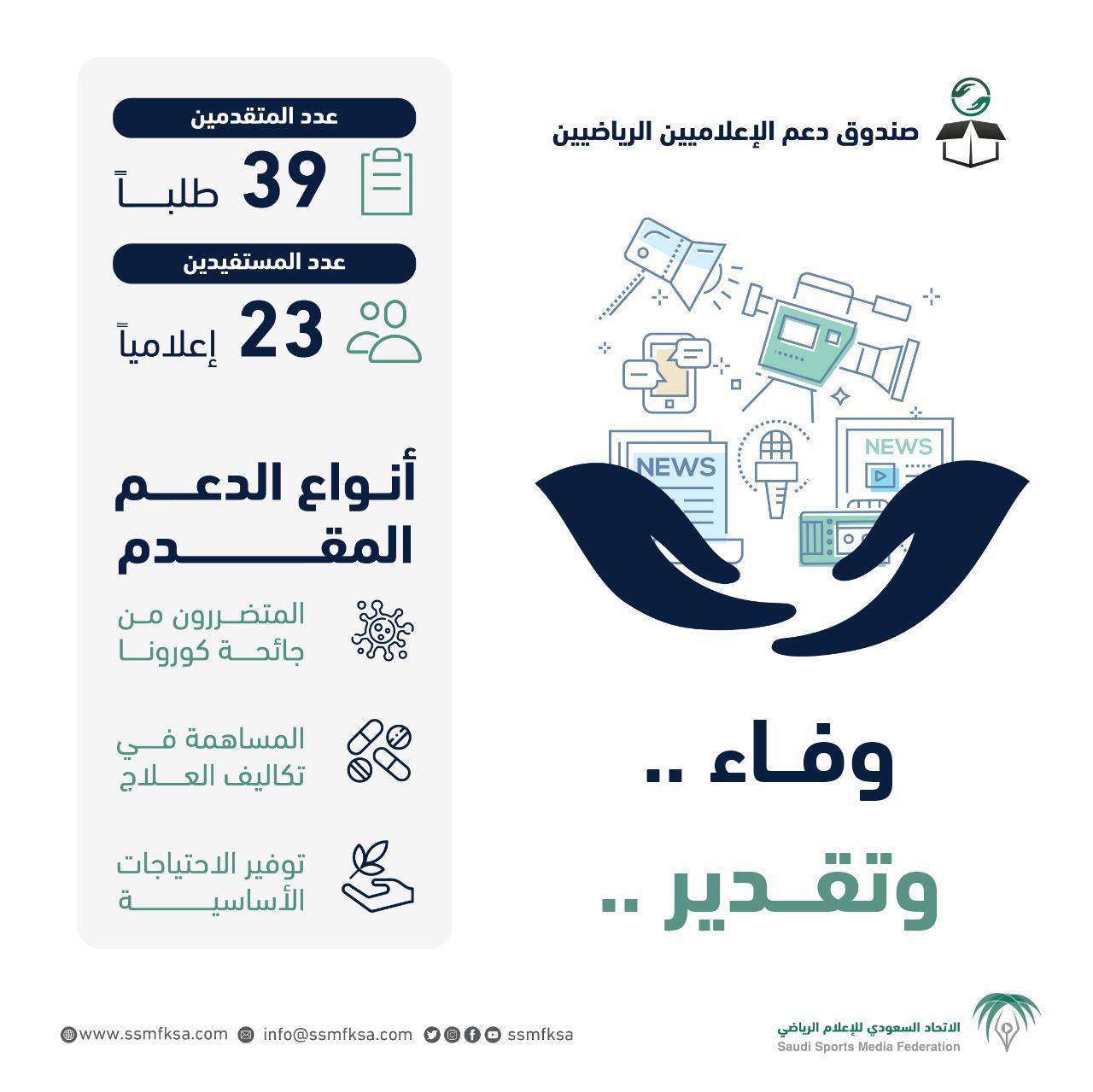 أعلن الاتحاد السعودي للإعلام الرياضي استمرار تقديم الدعم الخاص لعدد من الإعلاميين المستحقين ضمن مبادرة (صندوق دعم الإعلاميين الرياضيين)، وذلك بعد اعتماد لجنة صندوق الدعم صرف الدفعتين الثانية والثالثة وفق الأوجه المقرّة من مجلس إدارة الاتحاد التي تشمل سداد مديونيات المعسرين أو تحمّل بعض تكاليف الخدمات الصحية والعلاجية أو المساعدة في توفير الاحتياجات الأساسية لمن تنطبق عليه شروط الدعم.